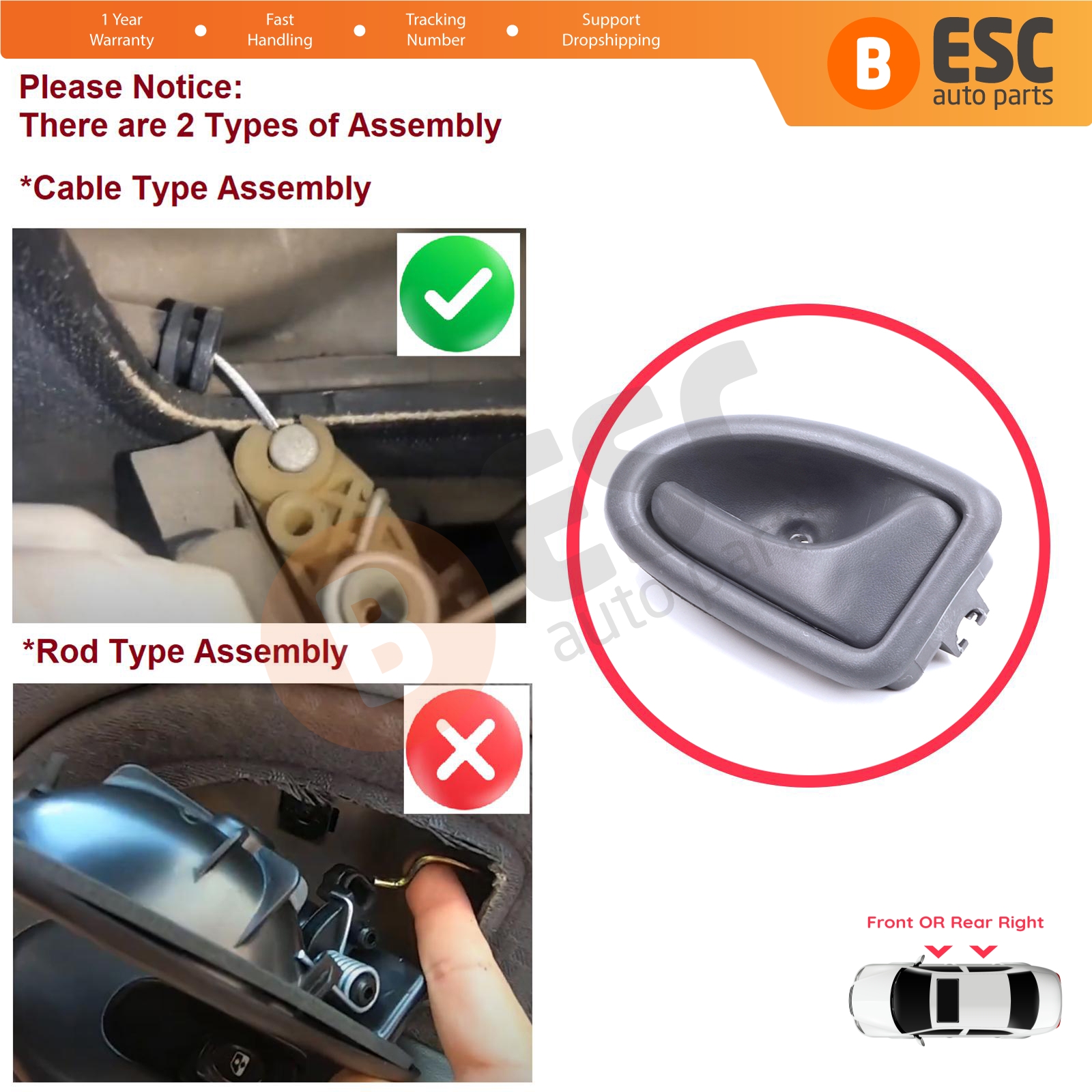 Interior Inner Door Opener Handle Front or Rear Right Door Gray Color Cable Type for Renault Clio 2 Scenic Megane 1 Trafic Master 2 Mascott Logan 1 Movano Vivaro A Interstar Primastar 1 Daily 8200028995