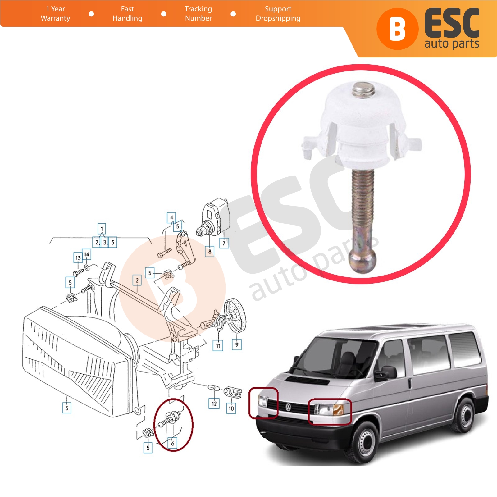 Front Left or Right Headlight Adjusting Screw Angle Adjustment Vertical Short Nose for VW Transporter T4 Caravelle 7D 70 Bus Van Box Platform 1990-2004 701941141A